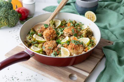 This tasty and nutritious one pot family friendly meal will be a hit in your household! I reduced the rice and added in extra cauliflower rice to boost the fibre (and also a great way to sneak in more vegetables). Serve with extra greens.