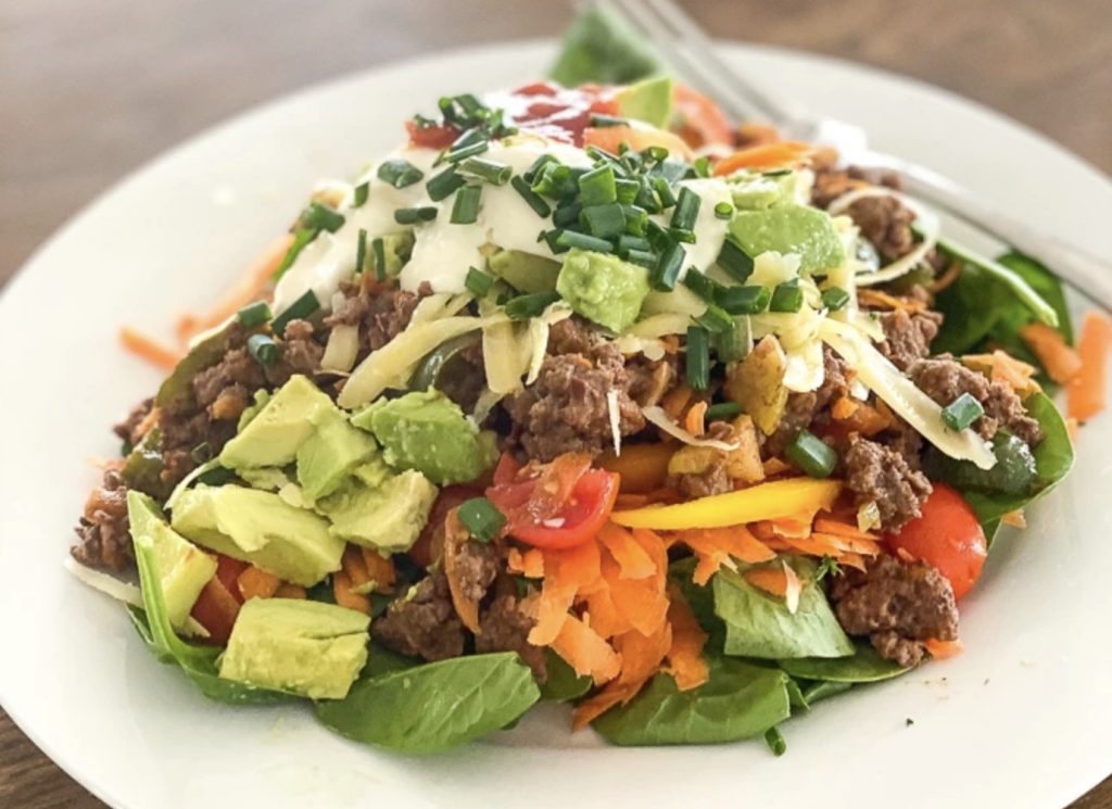 This easy to prepare Mexican salad will not take you longer then 20 minutes to whip up. Use any leftover vegetables you have in the fridge and add to salad. I used the El Paso Taco Seasoning mixture as it is so yummy, alternatively you can use a combination of paprika, cumin and salt.